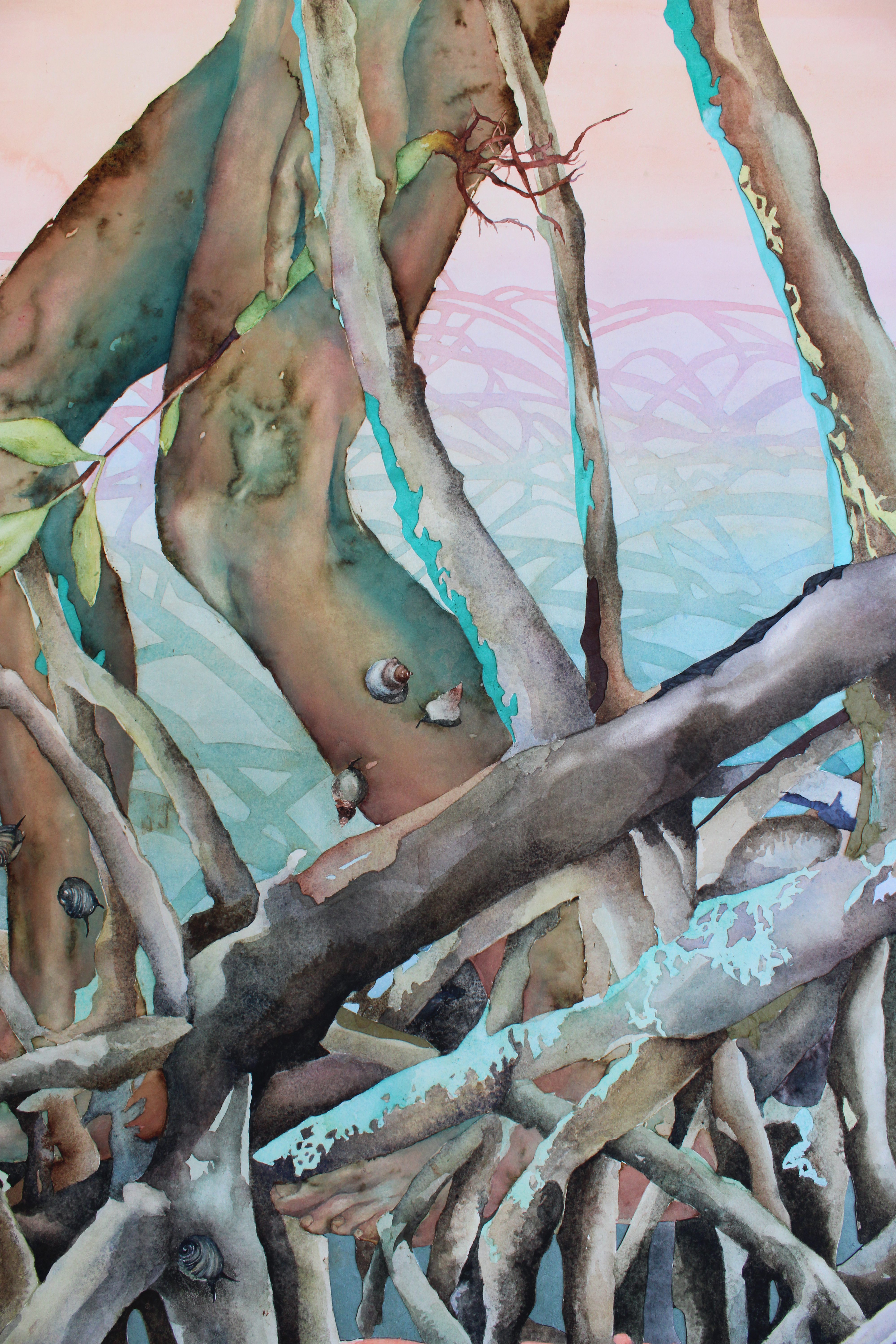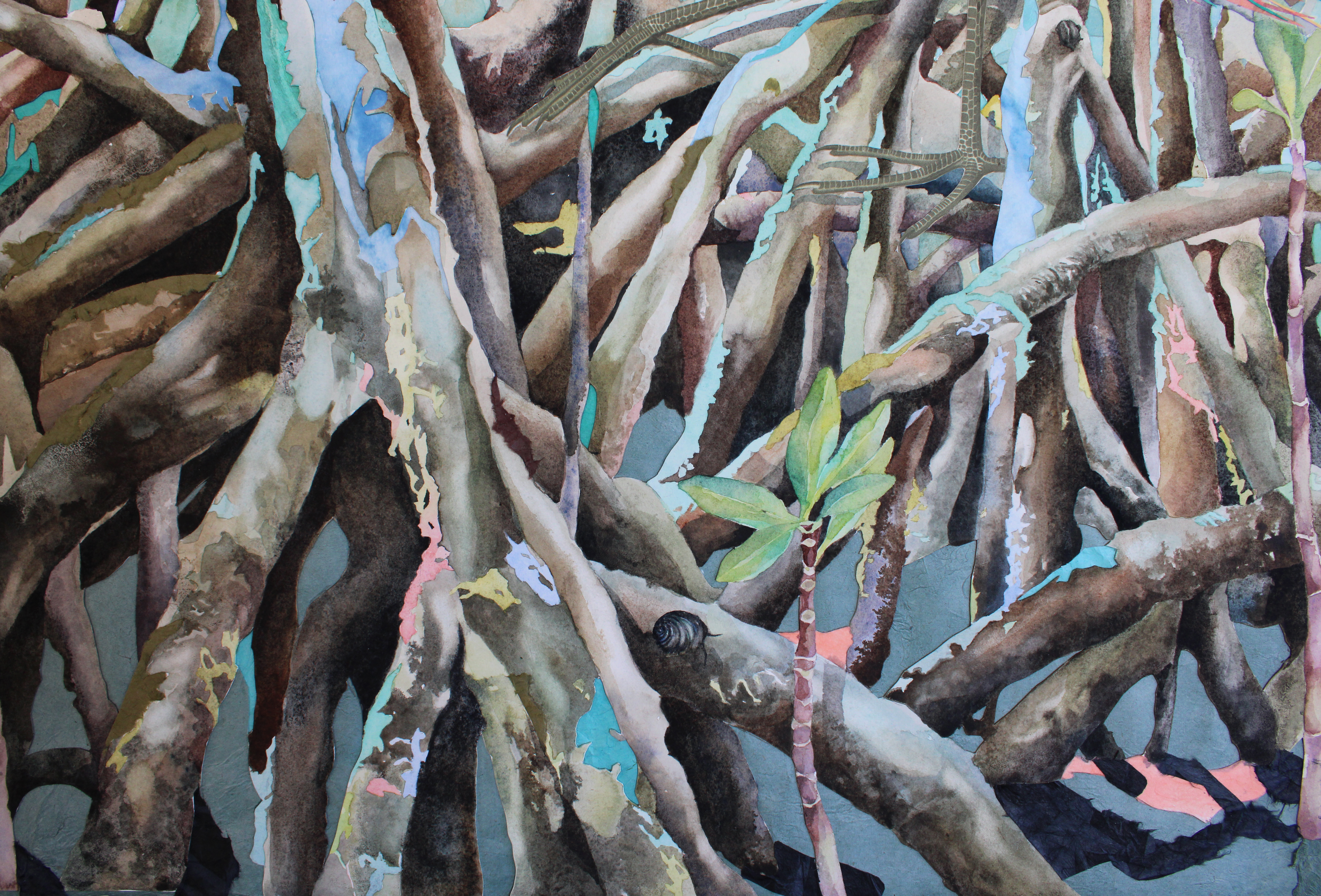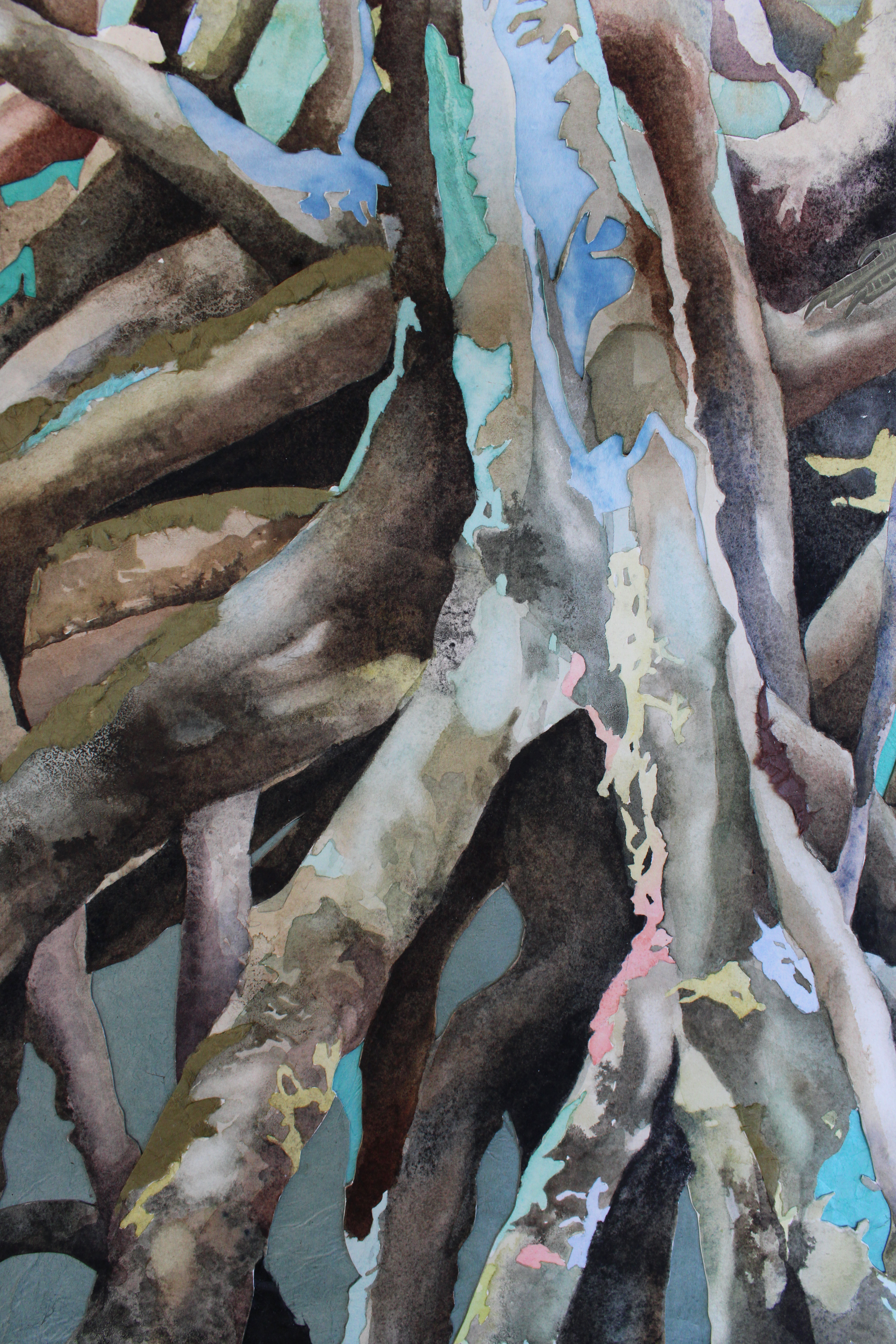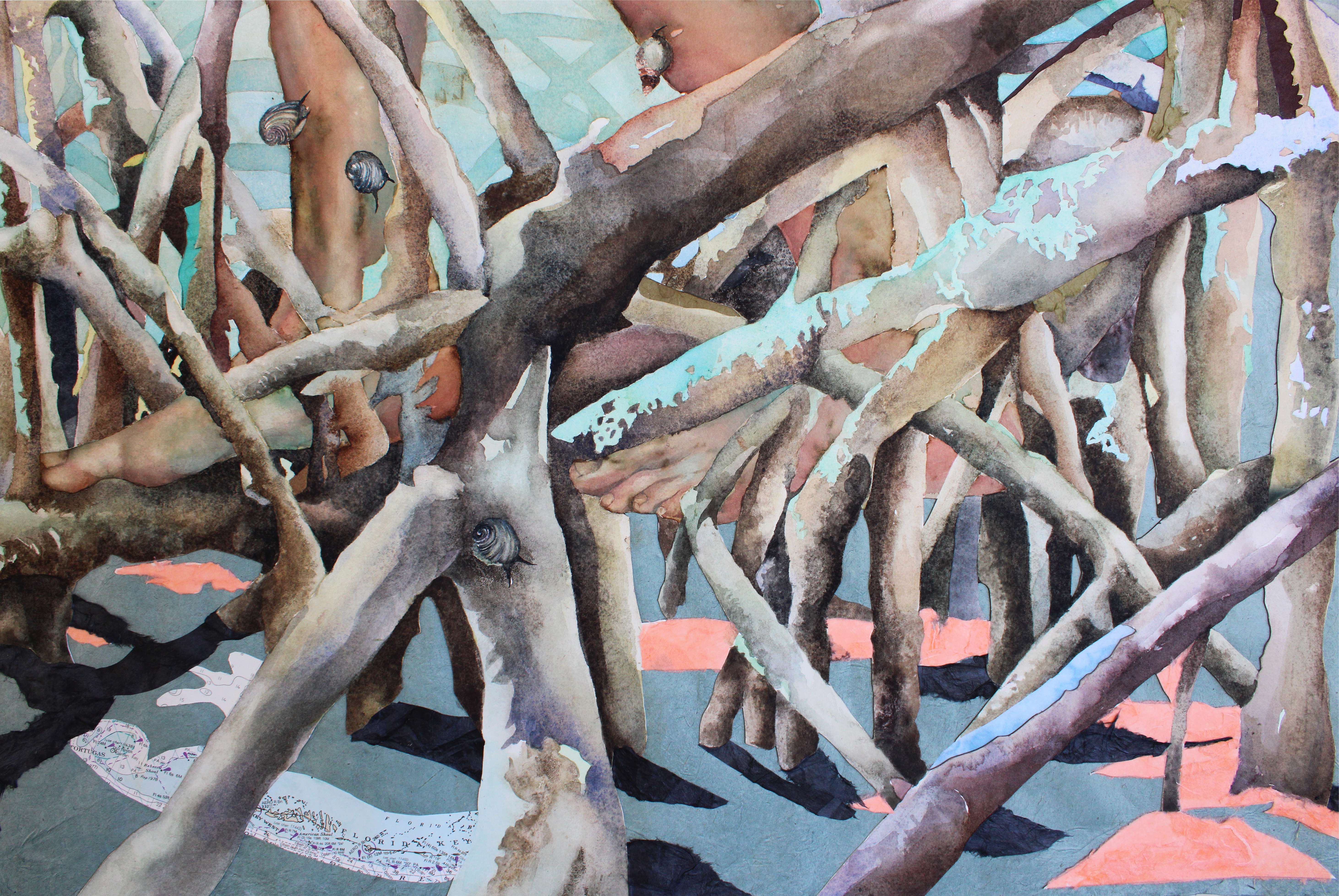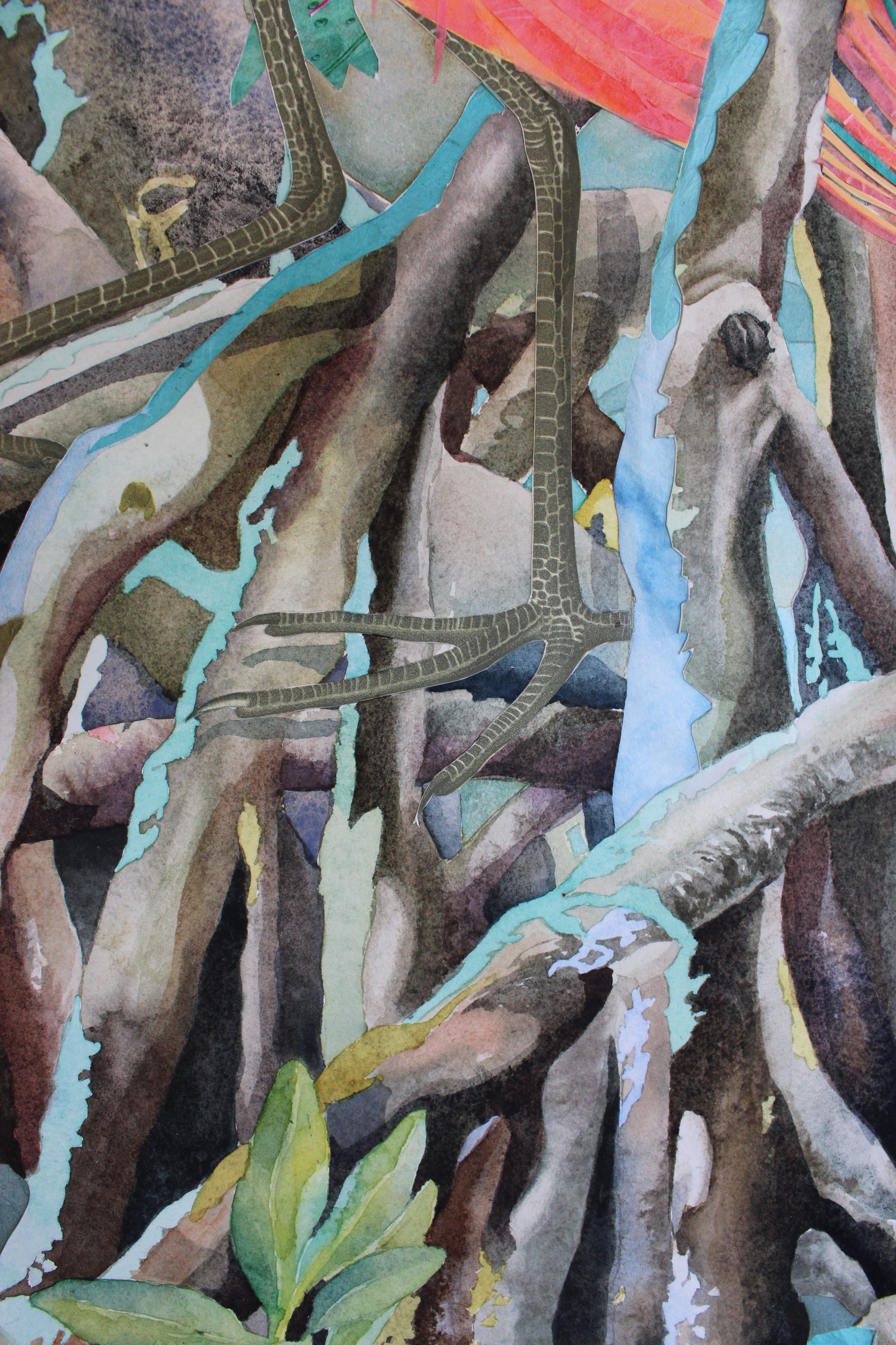 watercolor, coffee, walnut ink, and collage on hot press paper