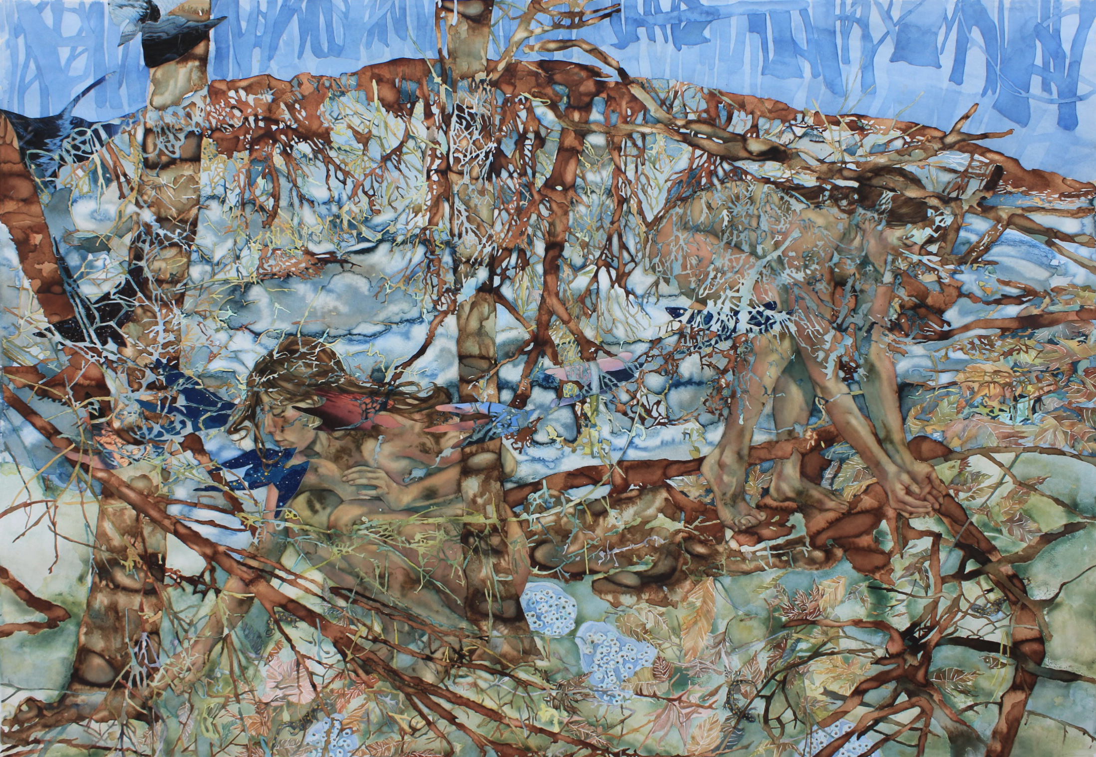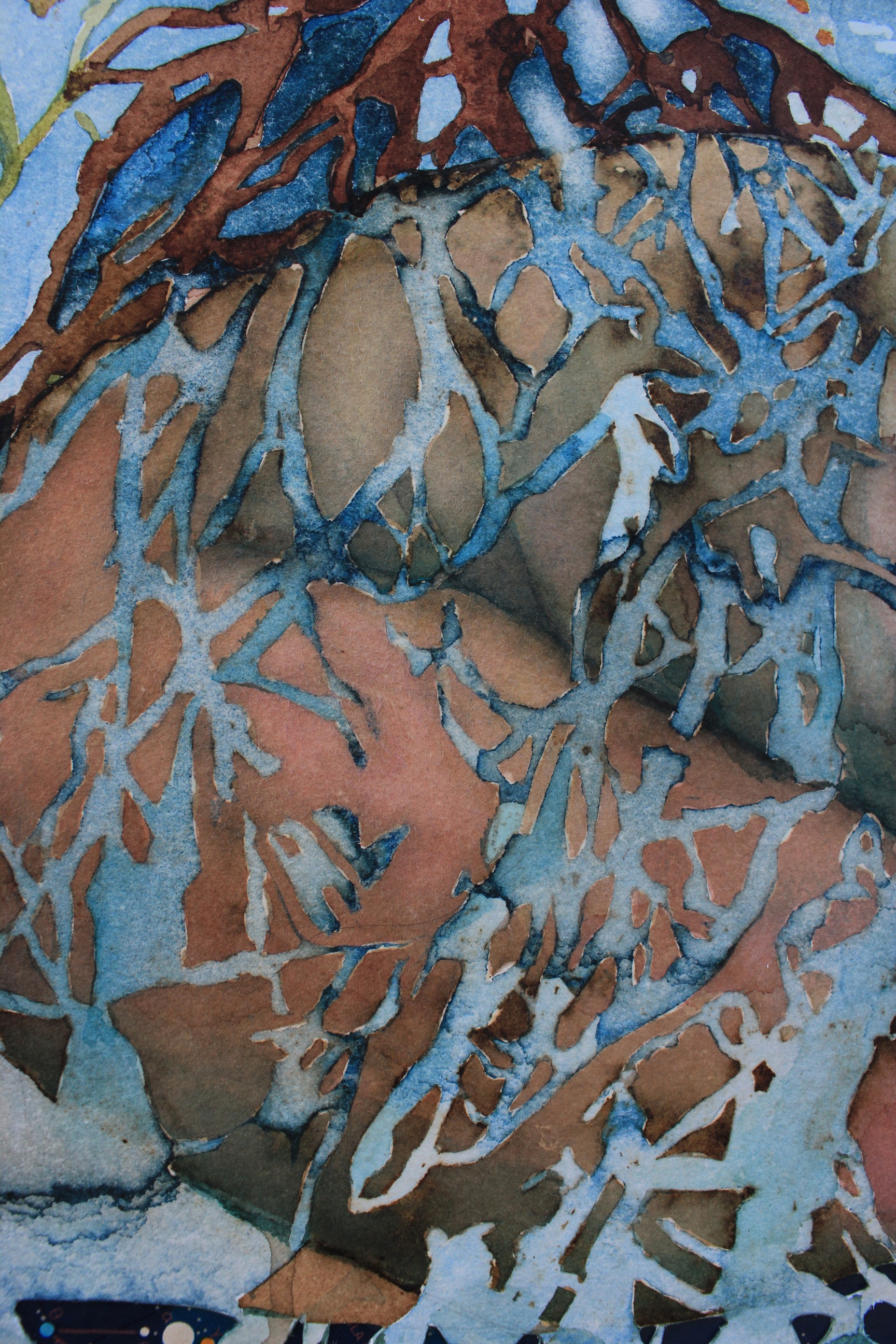 watercolor, coffee, walnut ink, and collage on hot press paper